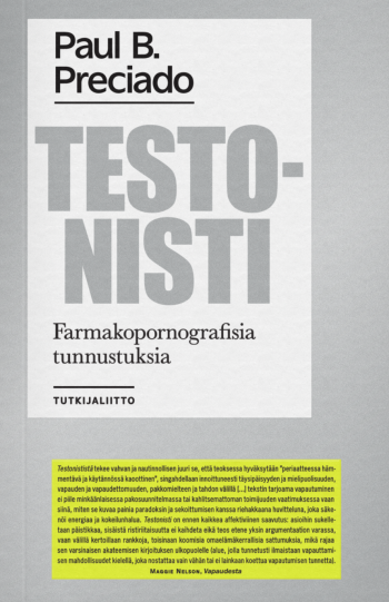 Feministiseltä politiikalta Preciado toivoisi liberaalista, keskiluokkaisesta ja moralisoivasta asenteesta irrottautumista. Olemme tyytyneet hyvin vähään. Valtavirtafeminismi, tai Preciadon termein ”valtiofeminismi”, on keskittynyt rankaisemaan kaikkein marginaalisimpia ryhmiä, kuten seksityöläisiä, ja päätyy järjestään tukemaan heteroseksuaalisuutta. Feministit voisivat vaatia paitsi hormonien vapauttamista ja sukupuolen säätelystä luopumista, myös miesten siemenjohtojen sulkemista, yleistä homoseksuaalisuutta, ”joukkolesboutta” ja masturbaatiopakkoa. Paremmassa tulevaisuudessa testogeelillä itsensä muokanneet cisnaiset voivat panna miehiäkin, kunhan aktia ei enää luulla heteroseksuaaliseksi. Feministit voisivat ehdottaa, että naiset saisivat periä velat korkoineen vuosisatojen maksuttomasta seksityöstä. Ilahduttavaa.