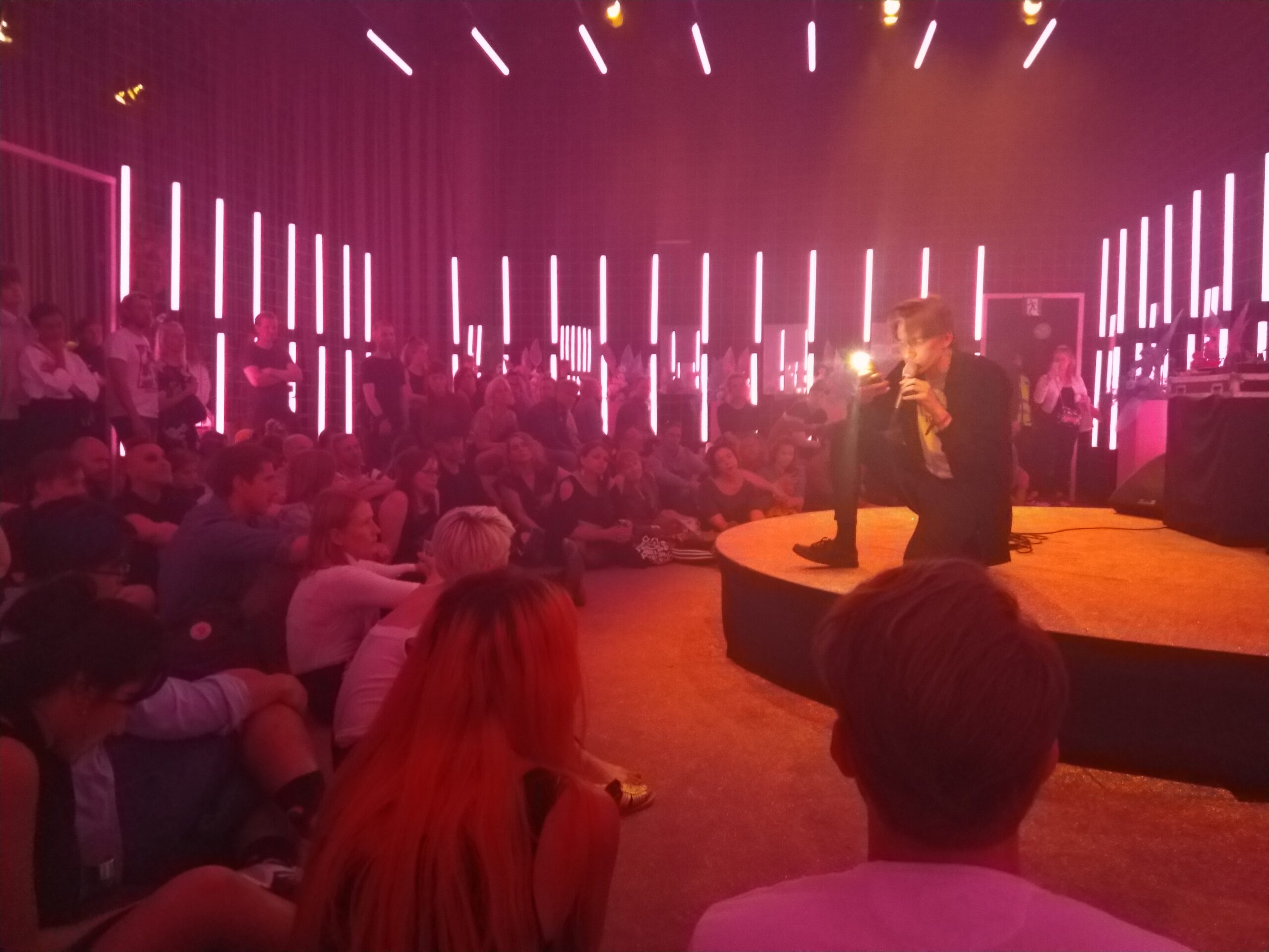 Minun on helpompi asettua tällaiseen yhteisille inhon kohteille ja ahdistuksille rakentuvaan yhteisöllisyyden tunteeseen kuin ulkona vallitsevaan näennäisen osallistavaan ilonpitoon. Kun astun Hallikaisen esityksen jälkeen takaisin festivaalihumuun, kaikki näyttää orastavan dystooppiselta. Väistelen ihmisiä kuin lopunaikojen heinäsirkkoja. Vetäydyn pressi-loungeen, jossa on illan tullen sytytetty jonkinlainen lasiputkeen vangittu nuotio.