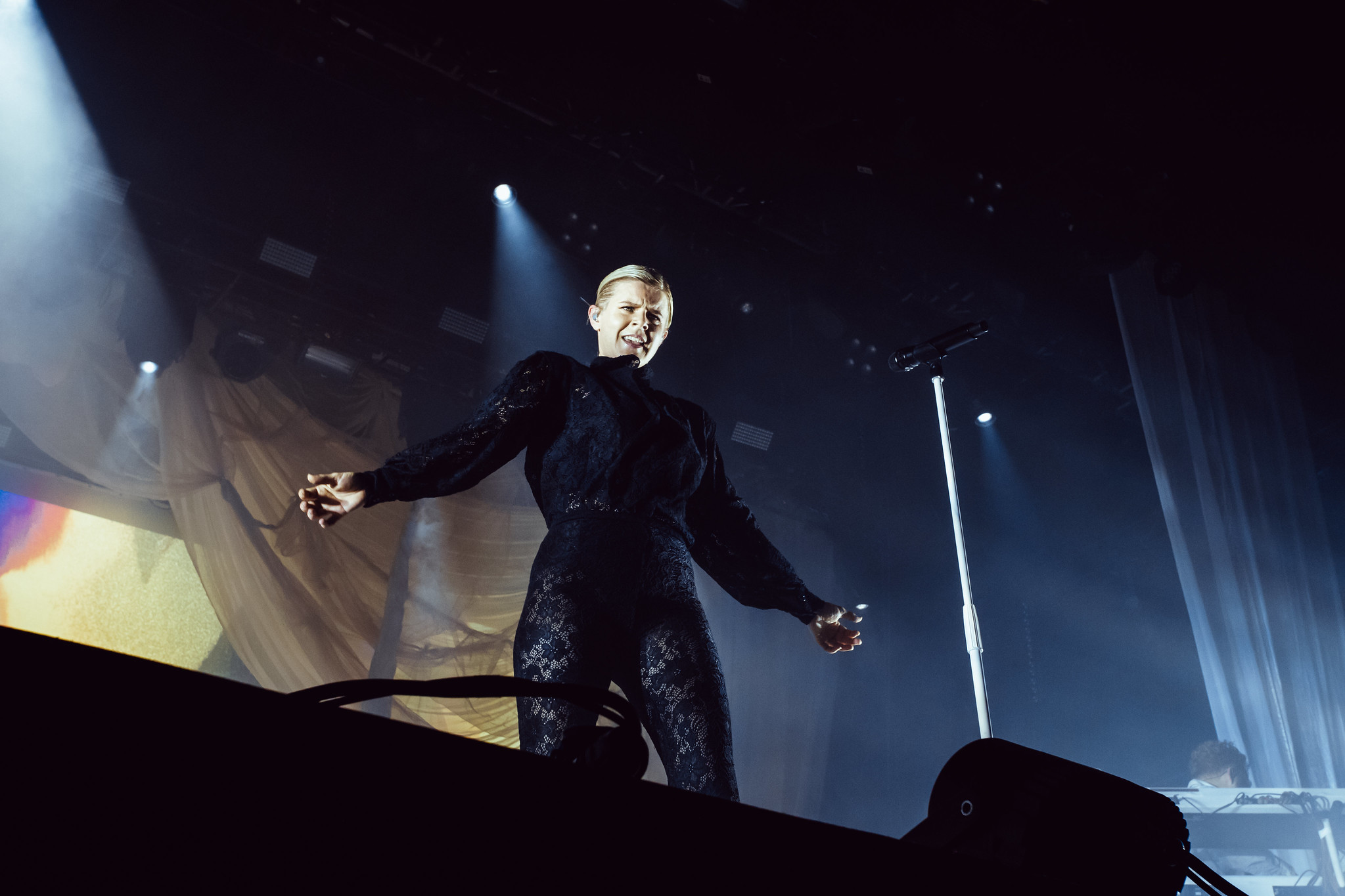 Robyn vaihtoi keikan puolivälissä vaalean pitsimekon mustaan asuun. KUVA: Riikka Vaahtera