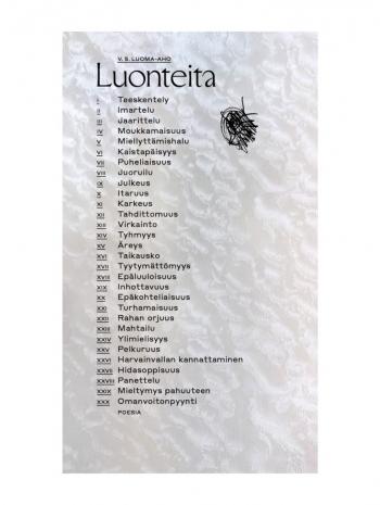 V.S. Luoma-ahon teos Luonteita esittelee 30 negatiivista luonnetyyppiä teeskentelijästä omanvoitonpyyntiin. Teos uudelleenkirjoittaa Aristoteleen seuraajan, 300-luvulla eaa. eläneen Theofrastoksen kokoelman Luonteita (Êthikoi kharaktêres) ja erityisesti sen suomennoksen vuodelta 1968, josta vastasi Pentti Saarikoski.