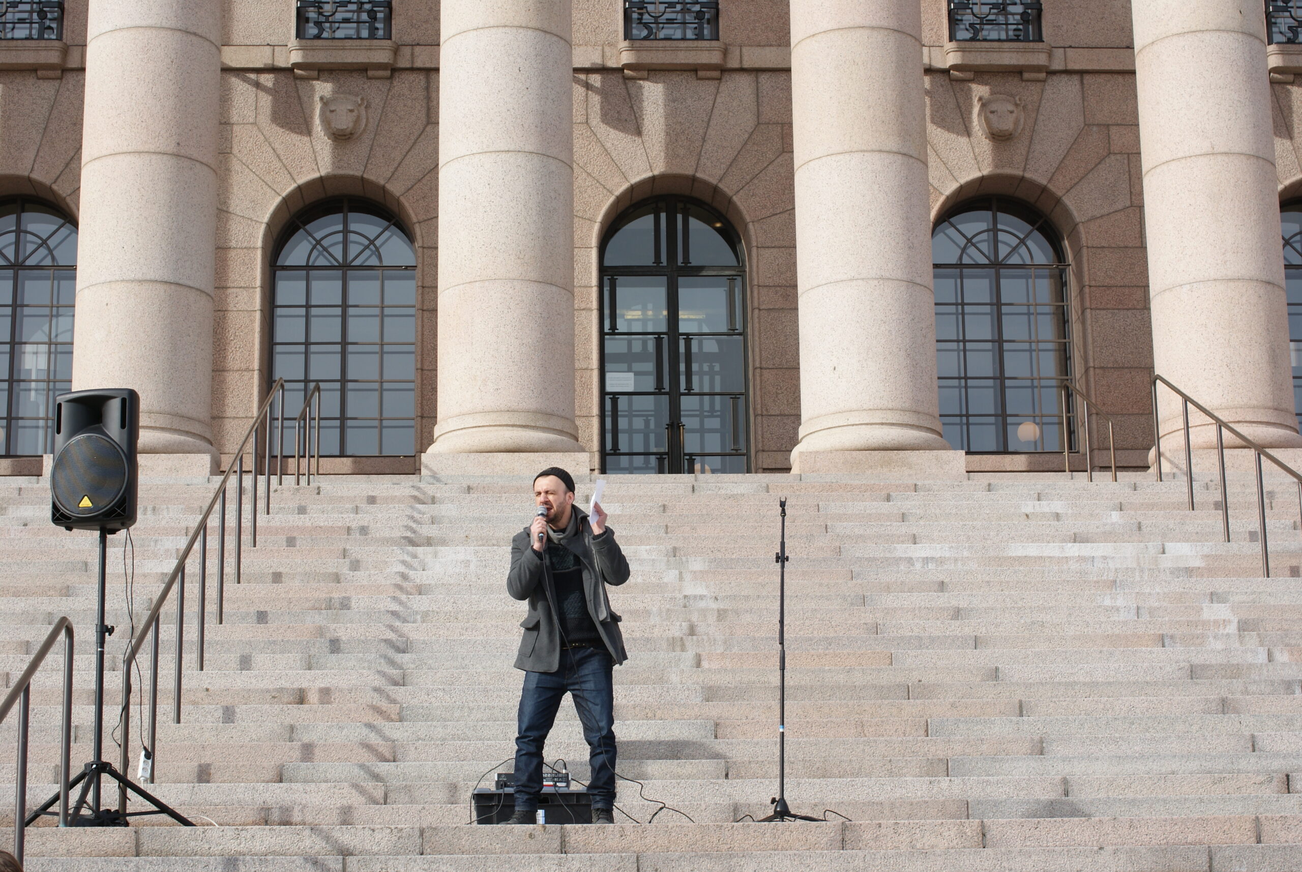 Sitten lavalle astuu Juha Valkeapää, eikä hänellä ole kiire mihinkään. Kuulemme äänirunon Ilmastonmuutos, ja kuullessani miten piiiirrrrrrrit ja arrrrrrrrrit kaikuvat Musiikkitalon seinästä Mannerheimintien kautta takaisin eduskuntatalon pihaan, ajattelen, että tämäpä on hienoa.