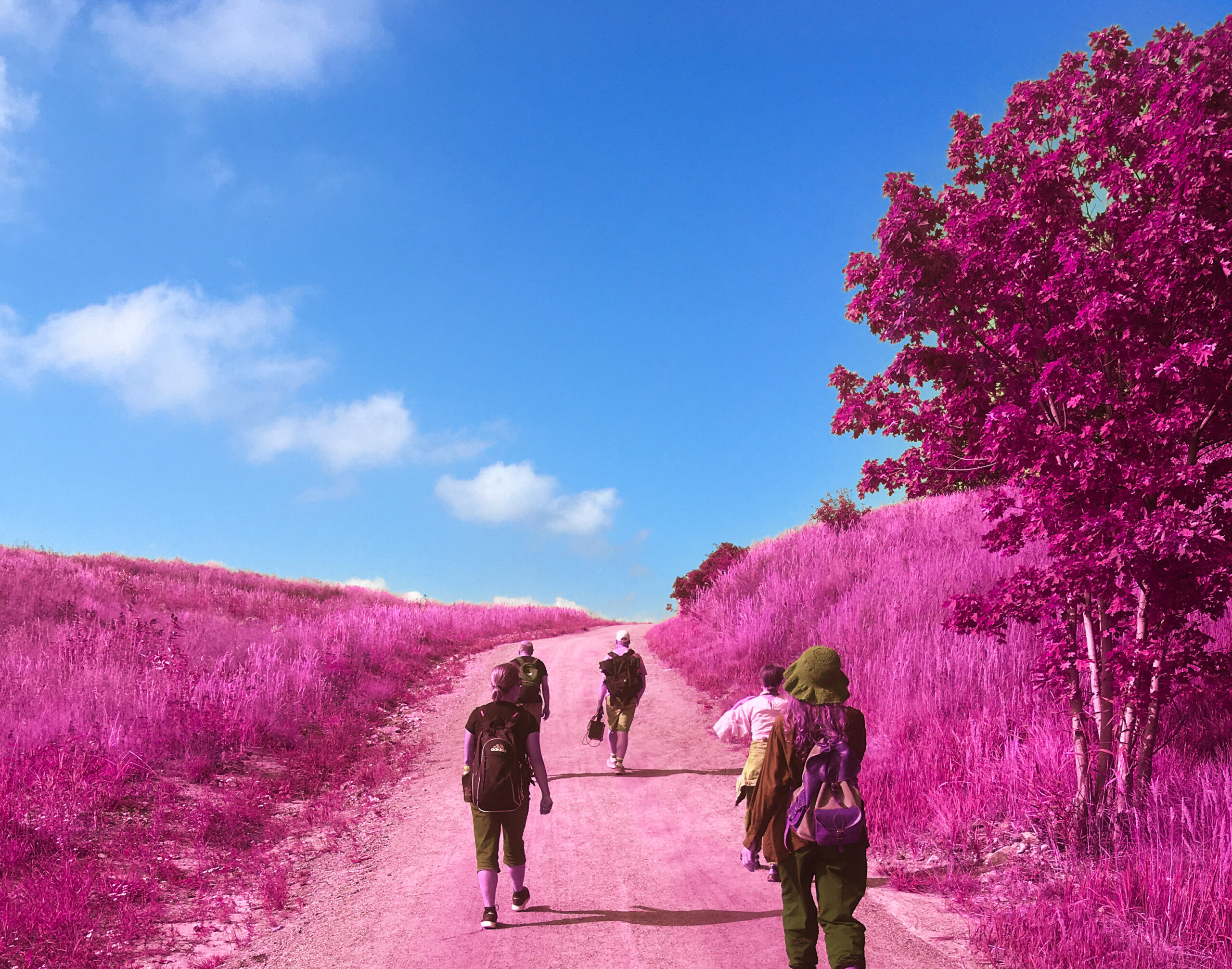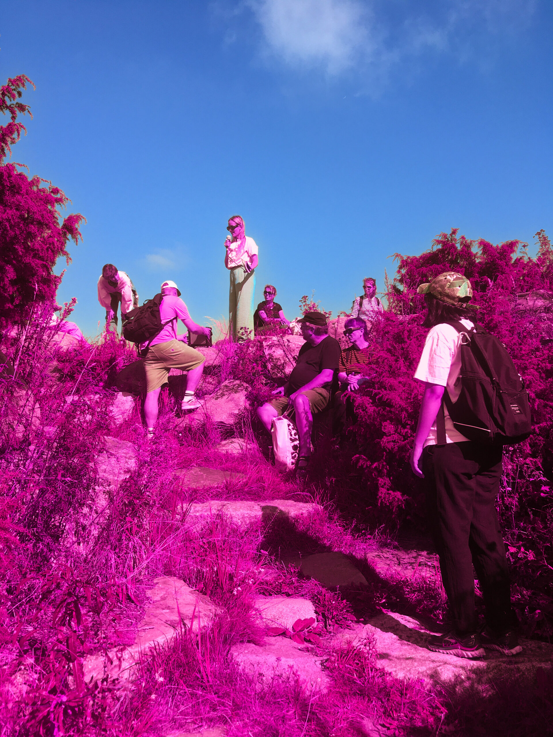 Yksi seurueestamme kävelee ilman kenkiä. Hidastan kysyäkseni häneltä siitä. Hän kertoo, että se on auttanut kipuihin ja hahmottelee kahdella sormenvedolla jalkateränsä romahtaneet rakenteet: pöydän ja holvin. Seuraan, miten joka askeleella hänen jalkapohjansa painautuvat maata vasten. Jatkamme matkaa yhdessä ryhmän hännillä.