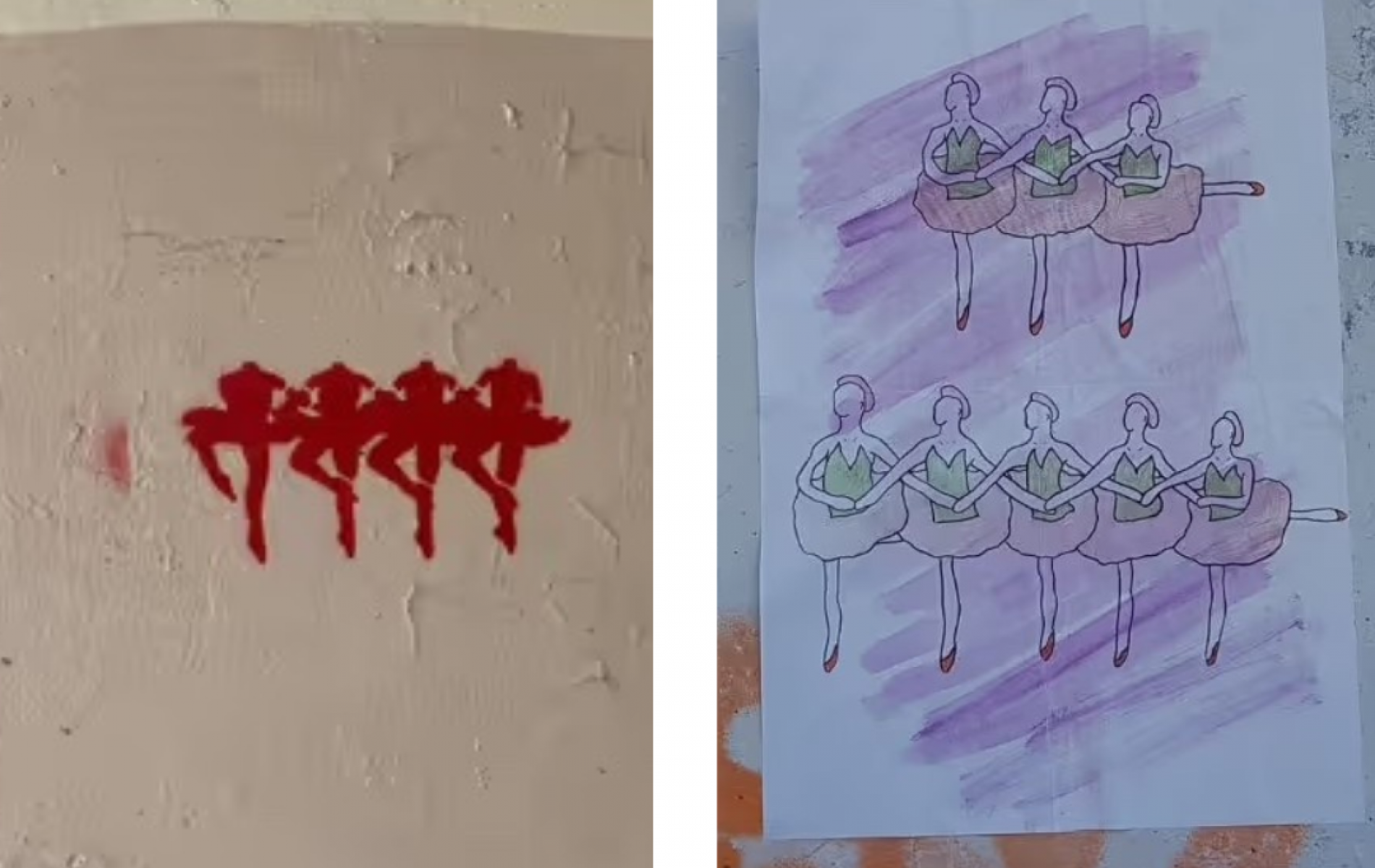 No Wobble! -verkkogalleriasta löytyy klassikkobalettia hyödyntävä kuva. Verenpunaisella spraylla maalatussa kuvassa neljä ballerinaa tanssivat ikonista Pienten joutsenten tanssia – päättöminä.