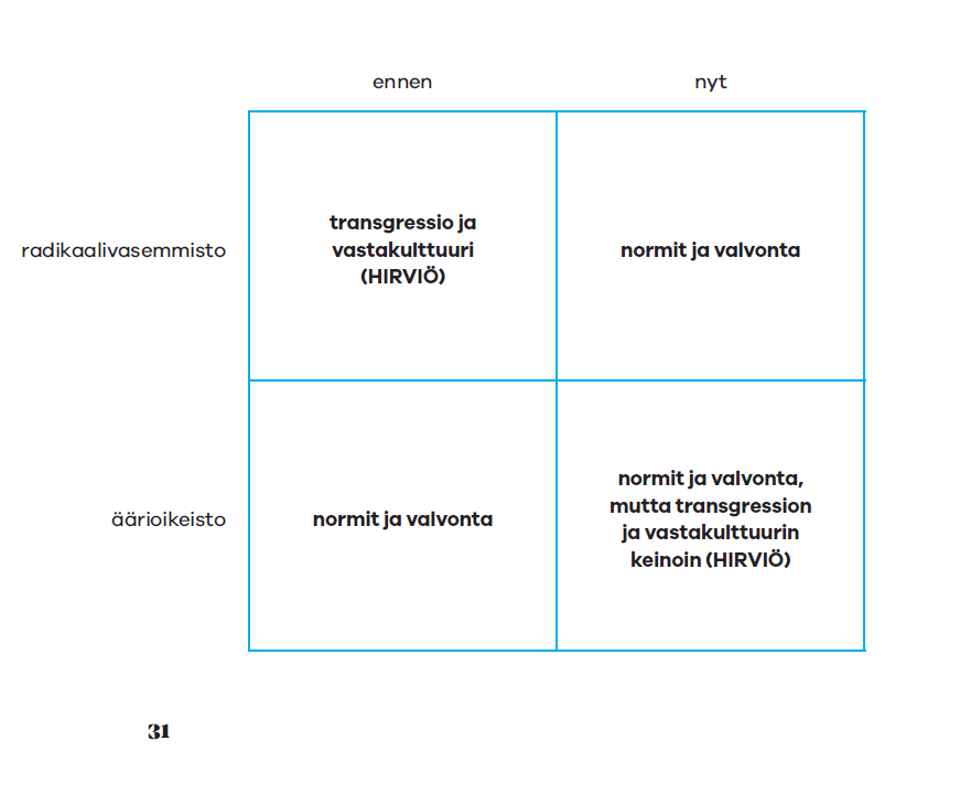 Olemme siis tilanteessa, jossa äärioikeisto yrittää esittää itsensä transgressiivisena liberalismin ylittäjänä. Hännikäinen sanoi puheessaan: ”Vasemmisto on luopunut vaarallisuuden aurastaan ja ojentanut sen meille hopeatarjottimella. Ja se on valtava etu, jota meidän pitäisi hyödyntää kaikin tavoin.”