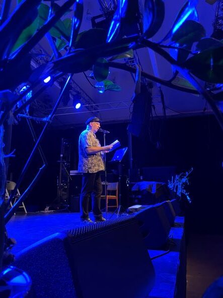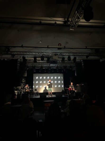 Ensimmäiseksi valokeilaan astelee turkulainen konkari Juha Kulmala, joka lukee tekstejä uusimmasta kokoelmastaan RESET (Poesia, 2022). Minimalistinen alustus maksimalistisille teksteille kertoo olennaisen: ”jos nyt jotain teema-aluetta hakee niin kaikki nämä kriisit”. Ja niitähän piisaa, ilmastokriisistä kapitalismiin ja politiikan viihteellistymiseen. ”Hipsterikustantamoiden hysteeridisko” on tästä show’sta kaukana, mutta Kulmala ei silti saarnaa. Paikoin kuivakan ironiset kiteytykset reväyttävät yleisön nauruun, kuten säkeissä ”on pakko jaksaa / tai joku tulee ja pitää motivaatiopuheen”. Mietin, että Kulmalan ”keikalle” osallistuminen voisi olla hyvä ja sukupolvia yhdistävä isä-tytär-aktiviteetti. Voisiko isänpäiväkirjojen mainoslistoille mahtua tänä vuonna myös runoa?