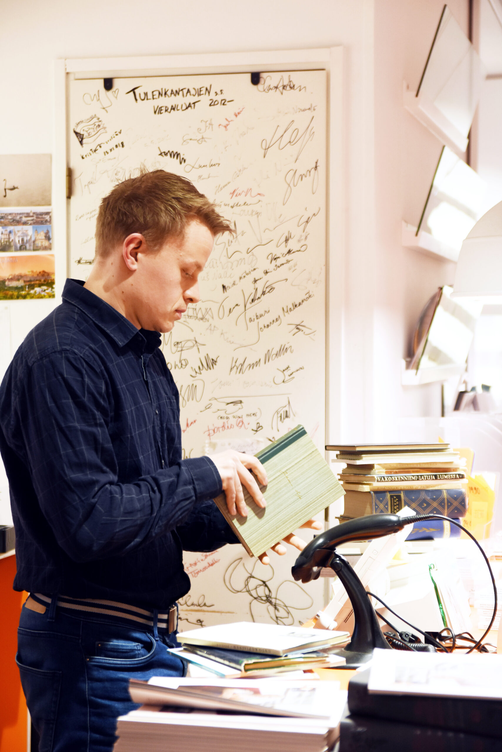 Juho Hakkarainen rientää usein kassan taakse myymään muutaman poistomyyntikirjan tai neuvomaan asiakkaita. Samansuuntainen keskustelu käydään moneen otteeseen sinä aikana, kun haastattelen myymälävastaava Hakkaraista ja kaupan perustajaa Erkki Kiviniemeä.
