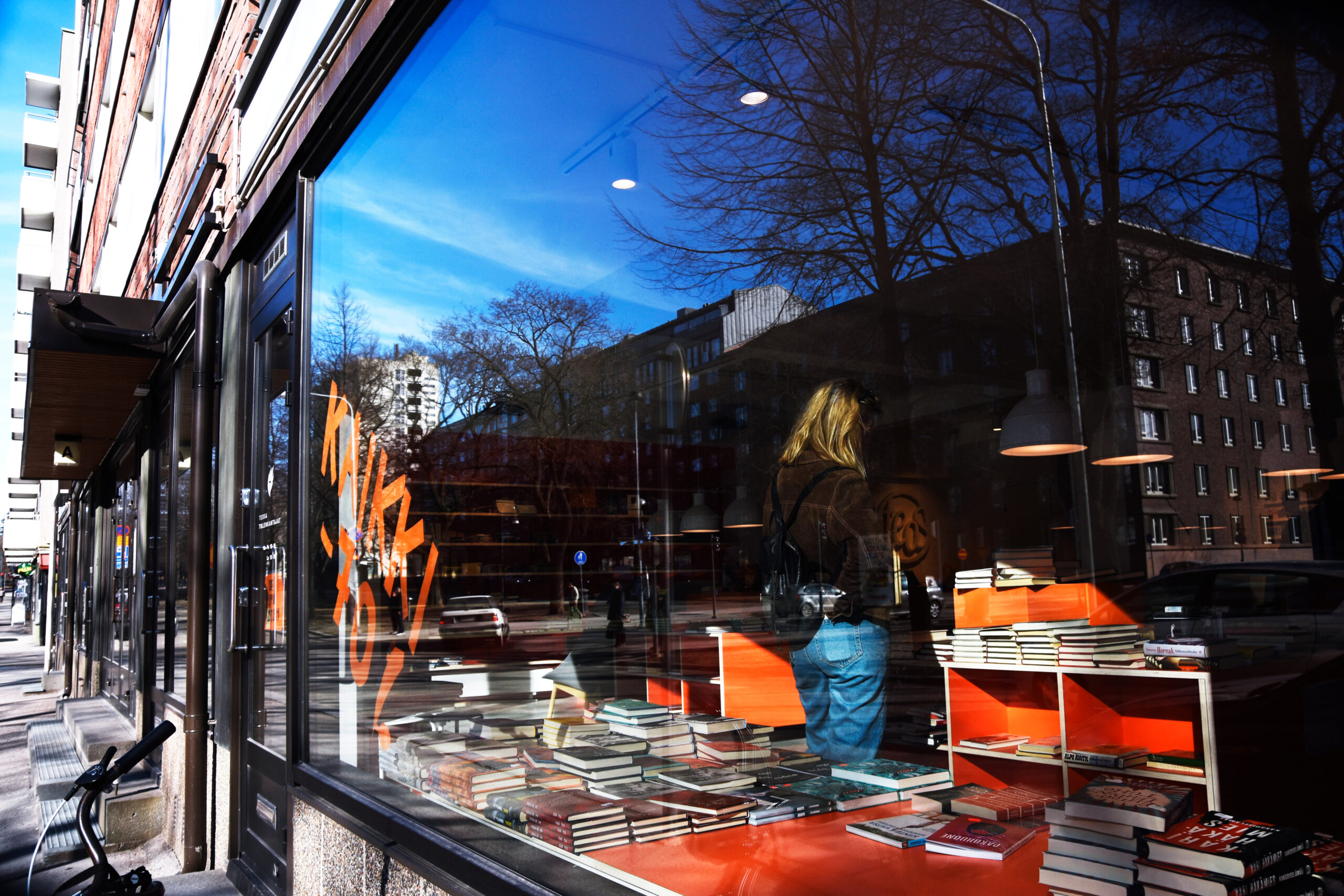 Kirjakaupassa viihtyi jopa viime vuoden ennätyshelteisenä toukokuuna, kun alkuillan valo tulvi suurista ikkunoista sisään. Esseekeskustelun jälkeen sekalainen porukka jatkoi poikkikadun yli olutravintolaan. Montaa uutta kirjaa paikan päällä juhlistaessa haaveilin, että täällä voisin joskus pitää omatkin julkkarit.
