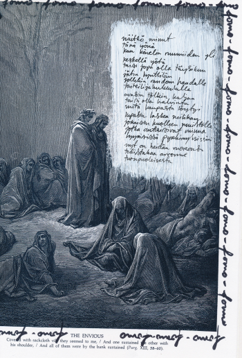 Ville Ylitervon runozinen emotional ensimmäisestä numerosta löydän uudelleentulkinnan Gustave Dorén (1832–1883) kuvituksesta Danten (1265–1321) La Divina Commediaan. Ymmärrän Ylitalon osin katkomasta kuvatekstistä, että Dorén kuvaansa taituroimat poloiset sovittavat siinä syntejään säkkikankaalla peitettyinä. Rangaistus vaikuttaa minusta kevyeltä Danten mittapuulla. Kuvan keskellä Dante ja Vergilius seisovat päänsä painaneina riutuvien hahmojen muodostaman kehän ympäröimänä kuin eivät kestäisi katsoa näkemäänsä. Mikä kauheus saa heidät niin hiljaisiksi?