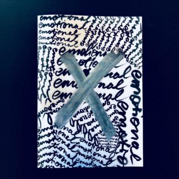 Ylitervo on peittänyt Dorén työn oikean yläkulman valkoisella akryylimaalilla, niin että siveltimen jättämää karkeaa tekstuuria tekisi mieli koskettaa. Tälle taustalle hän on kirjoittanut runon: